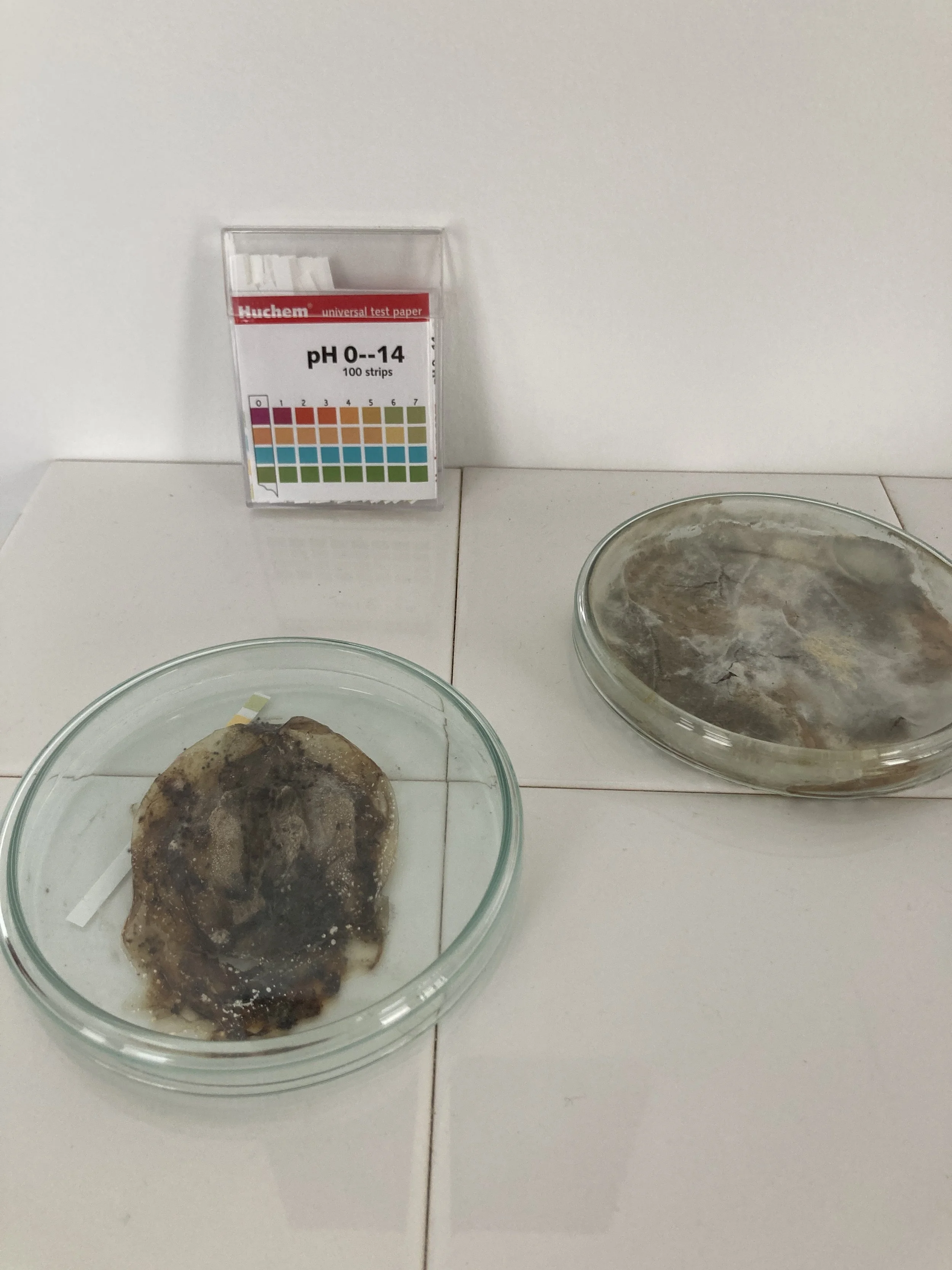 Zuurpruimen_69-96-2023 Pertrischaaltjes, tegels, latex, skoby, schimmel, PH-indicator strips30 x 90 cm
